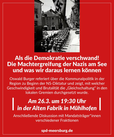 Oswald Burger referiert über die Kommunalpolitik in der Region zu Beginn der NS-Diktatur und zeigt auf, mit welcher Geschwindigkeit und Brutalität die „Gleichschaltung“ in den lokalen Gremien durchgesetzt wurde.