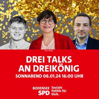 Die SPD Bodenseekreis lädt wie in jedem Jahr zur traditionellen Kundgebung zum Dreikönigstag am 06. Januar 2024 ein. Dieses Jahr werden die SPD-Parteivorsitzende Saskia Esken, der Vorsitzende der Gesamt-Jugend- und Auszubildendenvertreter der ZF, Tim Eppler und Professor Simon Koschut vom Lehrstuhl für internationale Sicherheitspolitik an der Zeppelin Universität zu Gast sein.